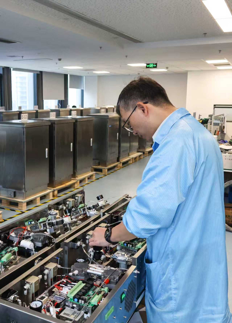 在公司展厅里,我们看到了目前团队已经开发出的几款成熟产品样机,其中之一就是公司明星产品CGX1009变压器油中气体光谱在线监测系统。